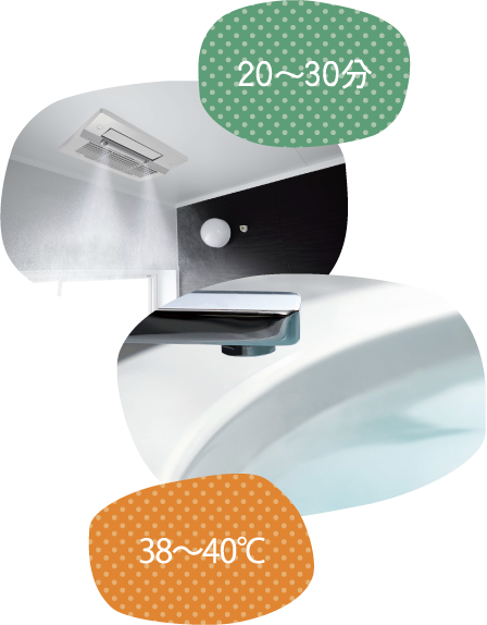 長時間にわたって浴室いっぱいに霧状の温水を充満させることから、大量の水を使用するとおもわれがちなミストサウナ浴。けれど、髪や体を洗うのに出湯しつづけなければならないシャワー浴にくらべると約1/5、湯量や湯温を保つのに足し湯や追い焚きをしなければならない浴槽入浴にくらべると約1/8の水しか使用しません。このように少ない水ですぐれた血行促進効果をもたらしてくれるミストサウナは、肌のヘルスアップにくわえ、毎日のエコアップも叶えてくれるといえます。
