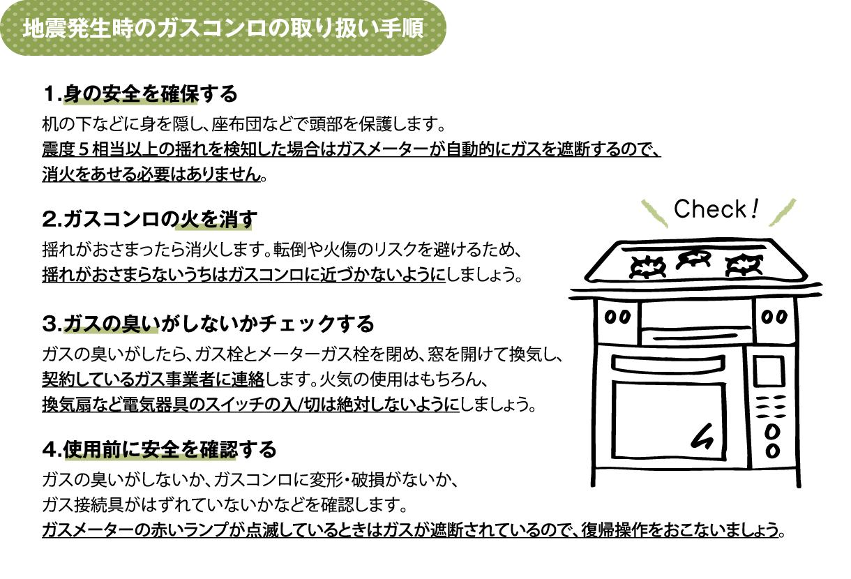 では、ガスコンロを使用しているときに地震が発生したらどのように対処すればよいのでしょう。